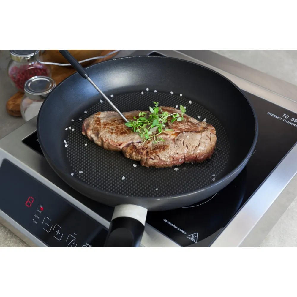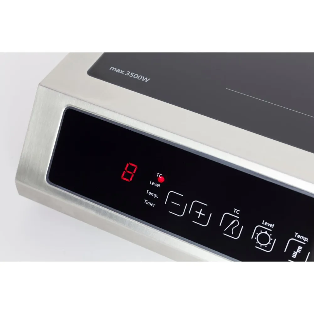 12 уровней мощности позволяют выбрать температуру для любого блюда. При помощи сенсорных кнопок на панели управления включается/выключается прибор, выставляется температура, мощность и таймер. Индукционная конфорка разогревается/остывает в 3 раза быстрее электрической, при снятии посуды нагрев прекращается автоматически. Данная модель оснащена встроенным термометром (точность до 1°C). Подходит для SousVide, поддержания температуры, обжарки мяса.