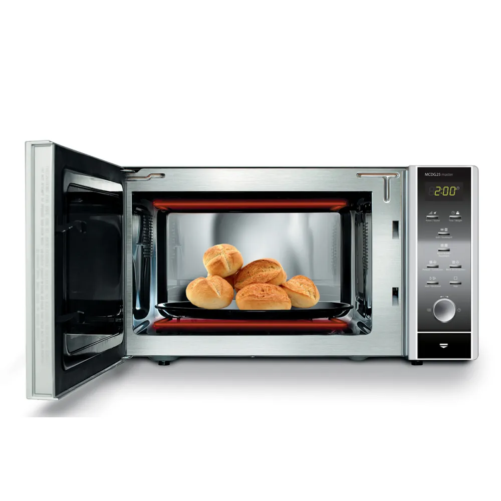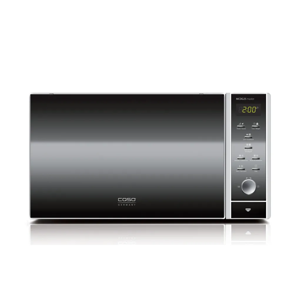 Микроволновая печь CASO MCDG 25 Master с вращающейся тарелкой из закаленного стекла (диаметр 32 см), которой достаточно для запекания тушки курицы целиком. Устройство работает в комбинированном режиме (микроволны и конвекция), что позволяет готовить блюда быстро и равномерно. Возможно приготовление в режиме «Гриль+СВЧ». Также печь может использоваться для разогрева и разморозки.