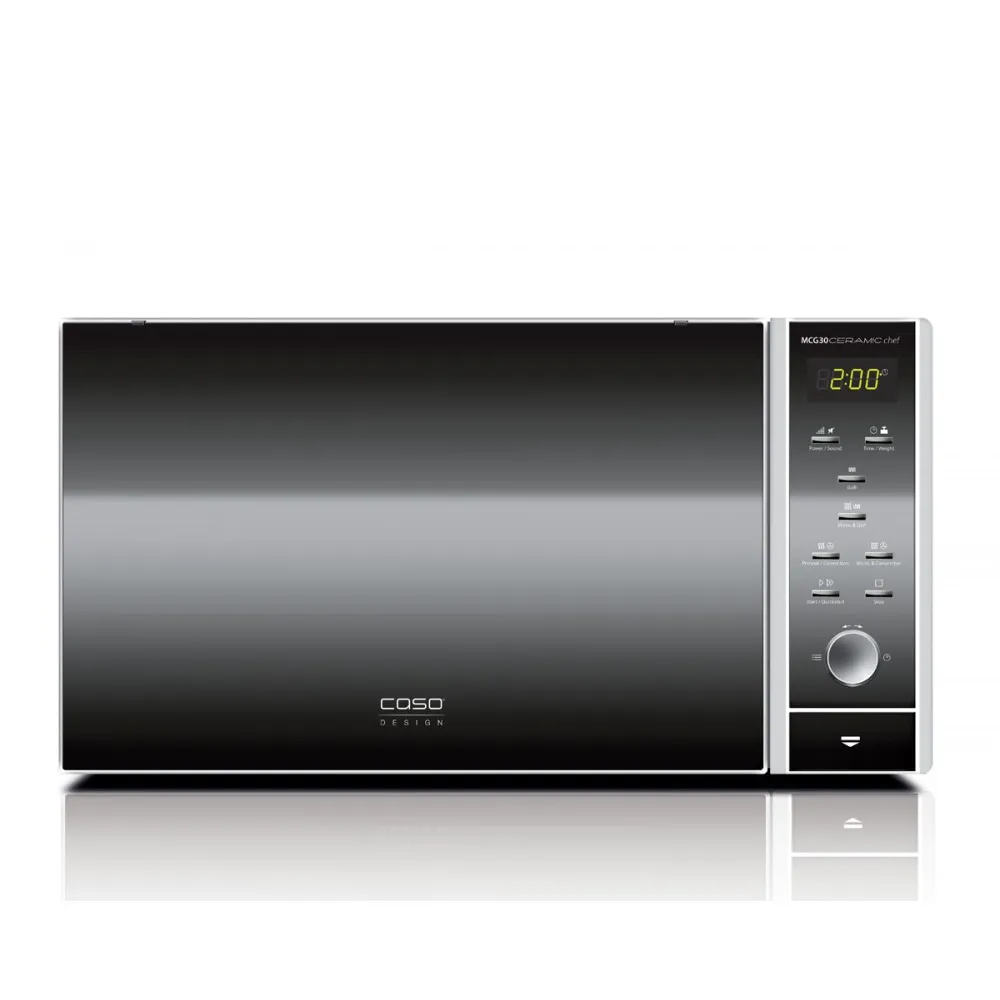 Микроволновая печь CASO MCG 30 Ceramic chef с керамическим дном (возможно приготовление пиццы или сразу двух куриц). Керамическое дно распределяет потоки волн в трех направлениях, поэтому блюдо готовится равномерно. Устройство работает в комбинированном режиме (микроволны и конвекция), что позволяет готовить блюда быстро и равномерно. Возможно приготовление в режиме «Гриль+СВЧ». В меню устройства есть 7 запрограммированных рецептов популярных блюд, что избавляет от поиска рецептов в интернете (нужно просто указать вес продуктов и нажать на кнопку «Старт»). 5 уровней мощности СВЧ, 10 уровней конвекции.