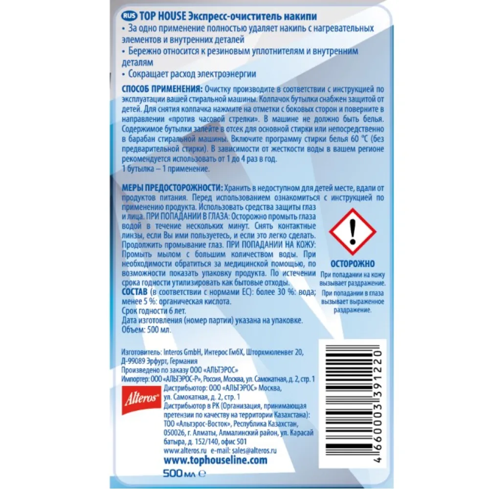 Экспресс-очиститель накипи для стиральных машин TOP HOUSE 500 мл. (391220)