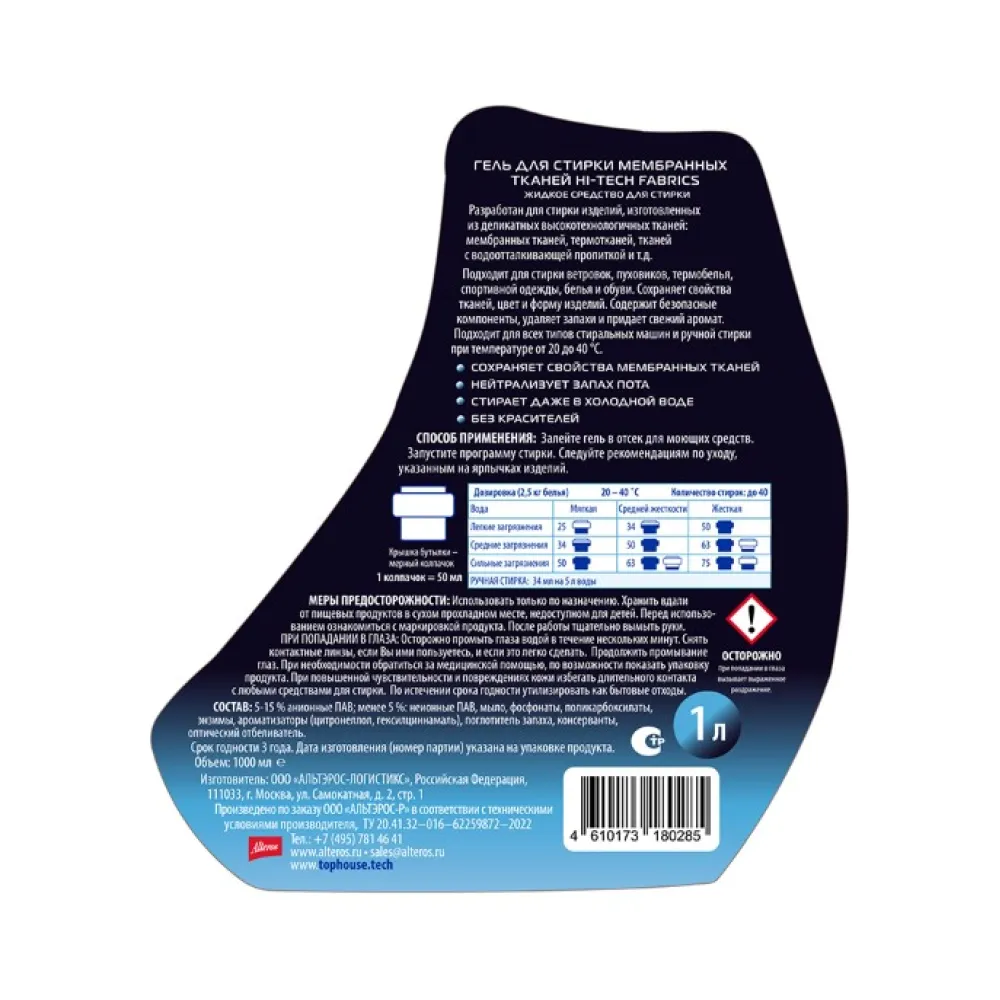 Гель для стирки мембранных тканей TOP HOUSE специально разработан для бережной и эффективной очистки мембранной одежды и спортивной экипировки. Уникальная формула геля очищает ткани, сохраняя их дышащие и водоотталкивающие свойства, что особенно важно для верхней одежды, туристической и спортивной экипировки.