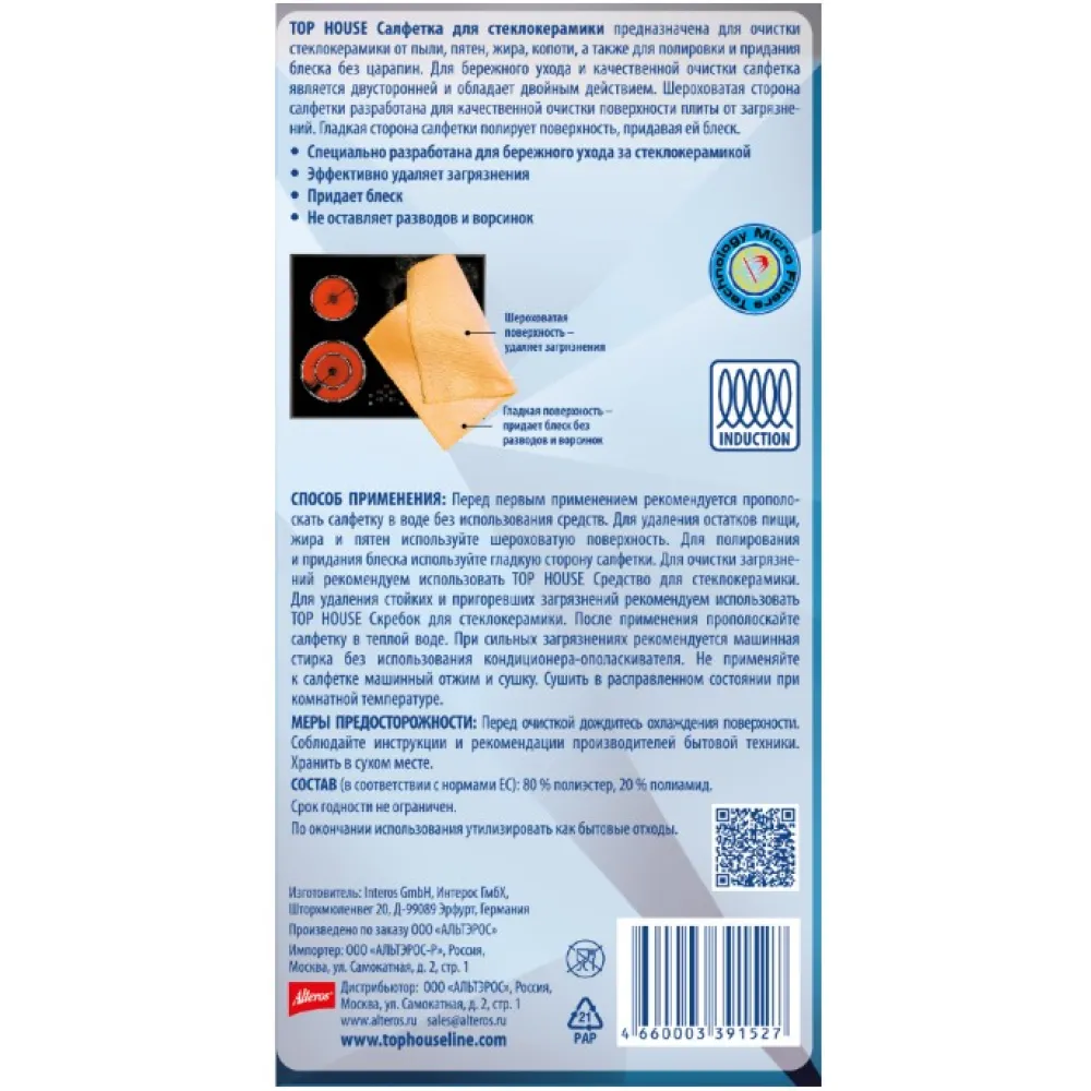 Салфетка для стеклокерамики TOP HOUSE идеально подходит для бережного ухода за стеклокерамическими поверхностями. Она эффективно удаляет загрязнения, жир и пригоревшие остатки пищи, не повреждая деликатные поверхности и не оставляя царапин. Благодаря особой микрофибре, салфетка превосходно справляется с задачей, обеспечивая поверхности блеск и чистоту.