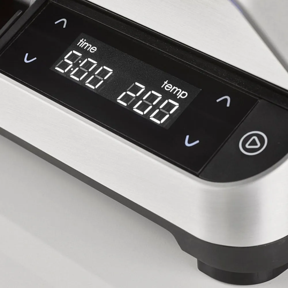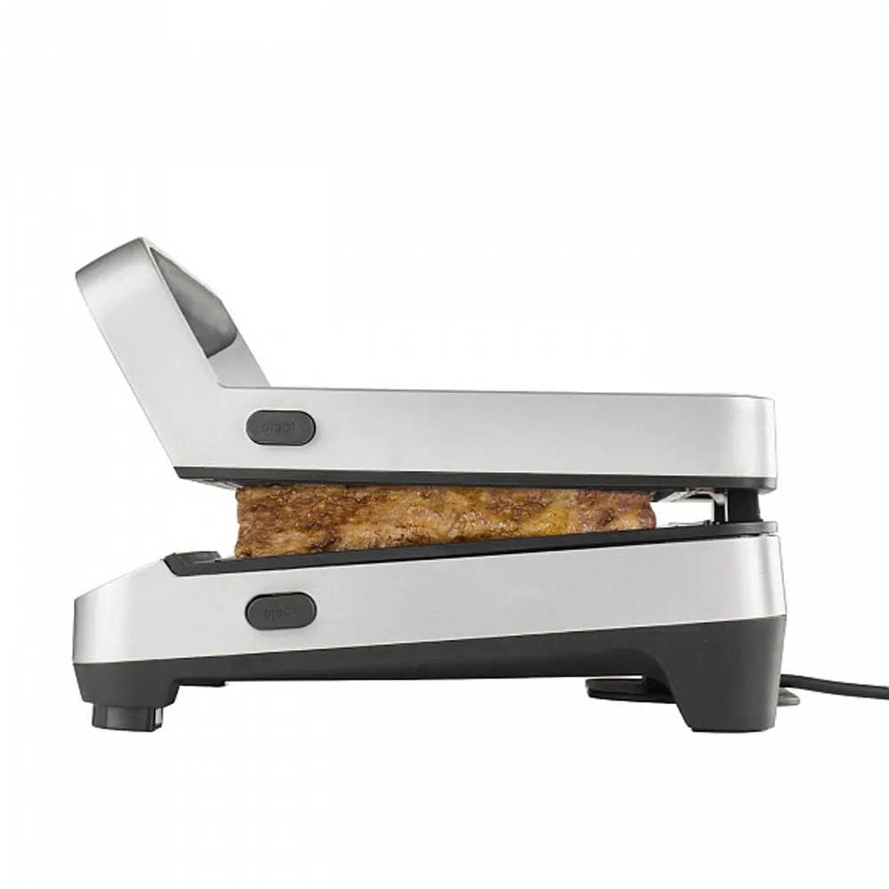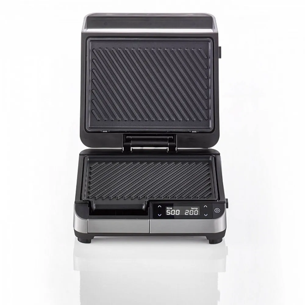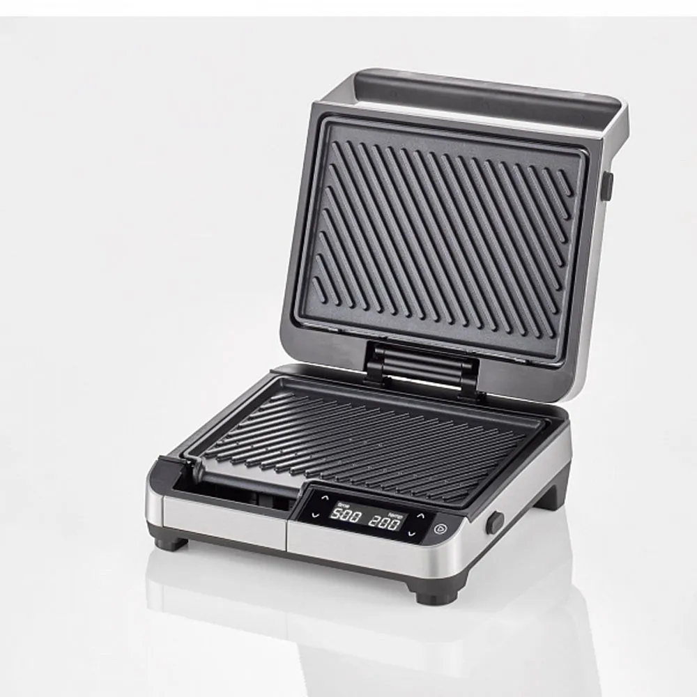 Установите время работы и выберите нужную температуру в диапазоне от 60 до 220 °С. После завершения программы гриль издаст звуковой сигнал. Не стоит беспокоится за размер продуктов, поскольку шарнир на крышке будет адаптироваться под нужную толщину.
