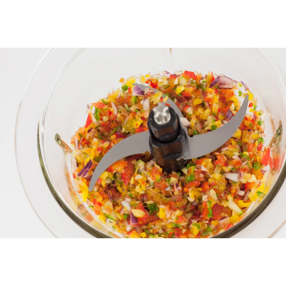 Кухонный измельчитель предназначен для измельчения CASO UZ 400 различных продуктов, от овощей, фруктов и орехов, до мяса и рыбы. Чаша устройства выполнена из прочного стекла, обладает объемом 1.2 л. Измельчитель оснащен четырьмя лезвиями из нержавеющей стали.