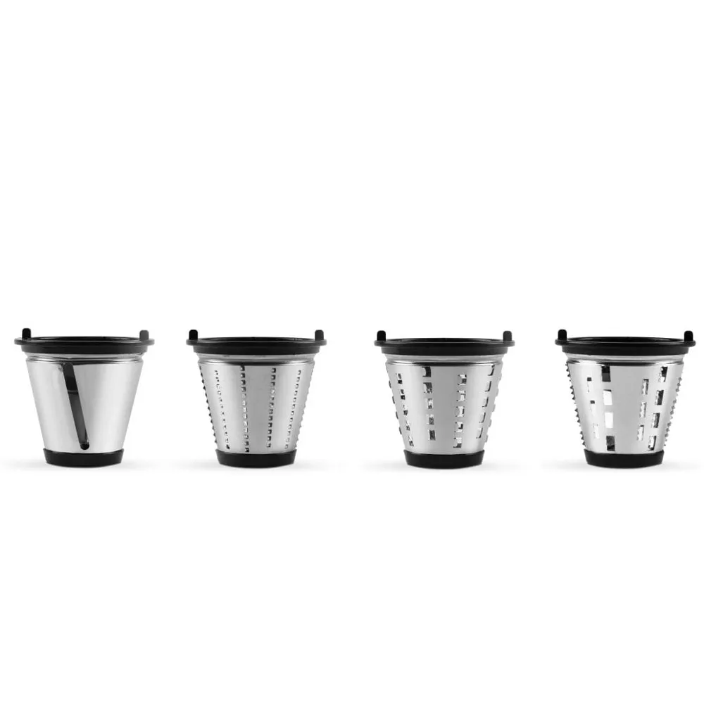 Солидное и многофункциональное устройство с корпусом из нержавеющей стали и терками из прочного металла. Помимо терок в комплекте конус для удобного попадания готового продукта в чашу. Идеально подходит для нарезки овощей для салатов и супов, сыра, орехов, картофеля, чипсов, шоколада и других продуктов различными способами.