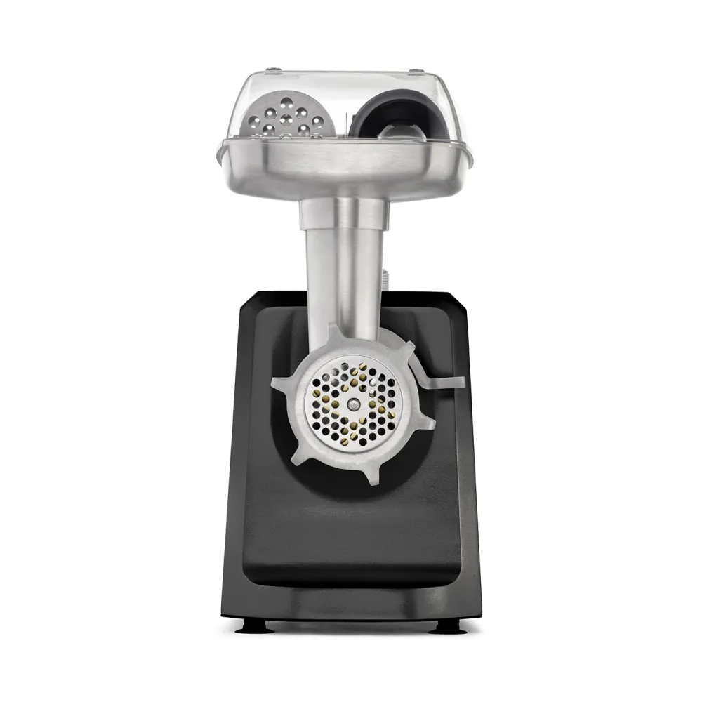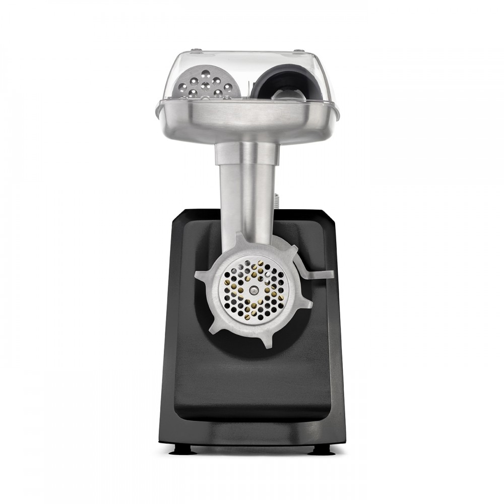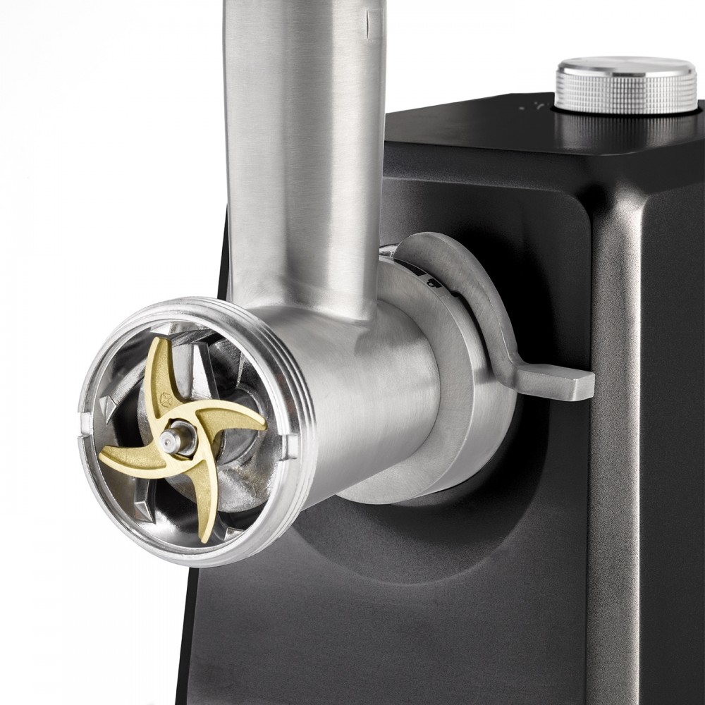 В комплект мясорубки входит пресс для котлет для гамбургеров двух размеров и котлет с начинкой. Также комплект включает в себя три перфорированных диска из нержавеющей стали (3 мм, 5 мм и 8 мм), насадку для колбас, насадку для выпечки с четырьмя формами. Благодаря легкой сборке и разборке всех деталей чистка невероятно проста. После использования аксессуары можно хранить в большом алюминиевом поддоне для экономии места.