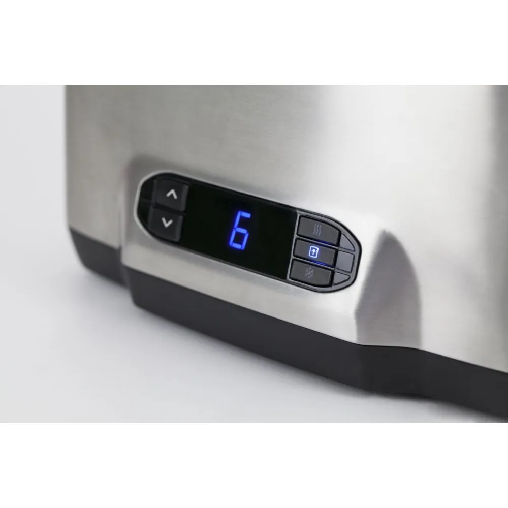 Тостер для обжаривания ломтиков тостового хлеба, предназначен для использования в квартирах, частных домах, офисах и отелях. Рассчитан на одновременное поджаривание 2 ломтиков хлеба. По окончанию приготовления тосты автоматически поднимаются. Данная модель оснащена ЖК-дисплеем с индикатором степени прожарки.