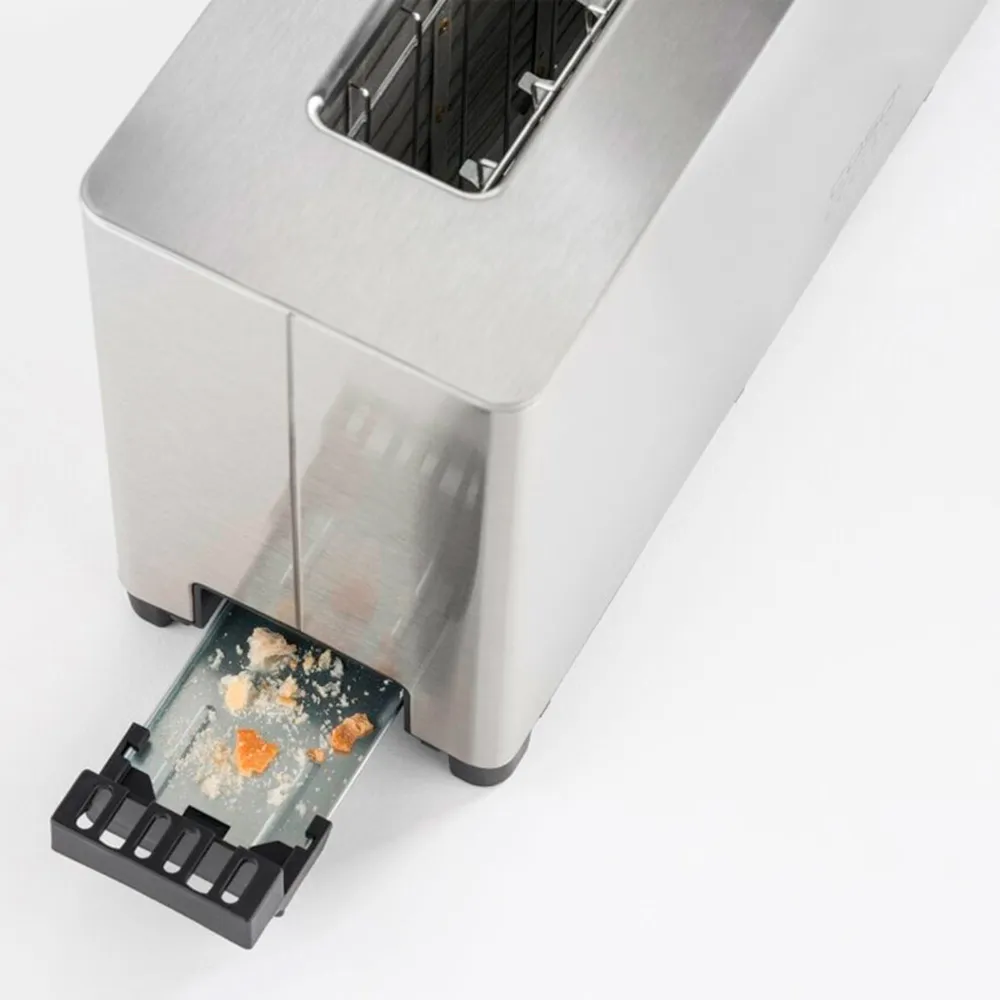 Корпус тостера выполнен из нержавеющей стали. В комплекте идет лоток для крошек, который позволяет легко убрать остатки хлеба из тостера и поддерживать кухонный стол в чистоте.