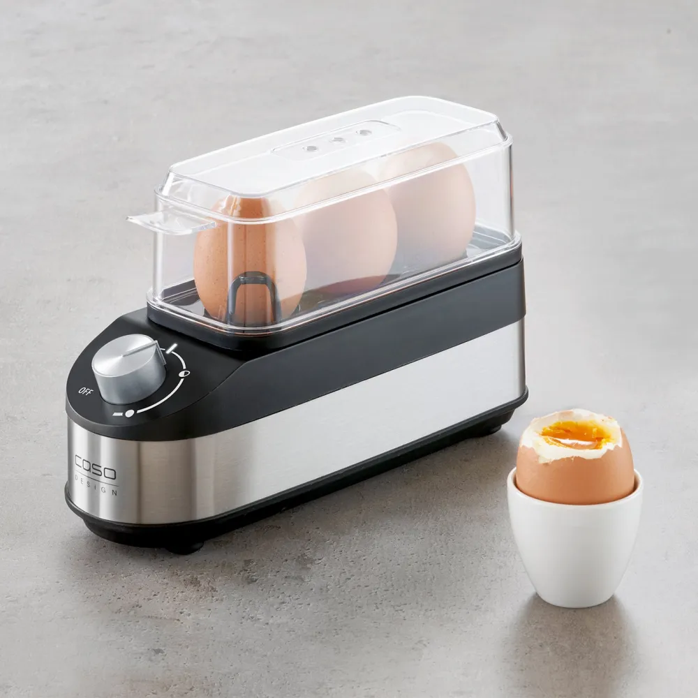 Компактное устройство, которое позволяет готовить яйца на пару с минимальным количеством воды. Яйцеварка CASO E 3 рассчитана на одновременную варку до 3 яиц. За один раз возможно приготовление яиц различной консистенции (всмятку, вкрутую, в мешочек).