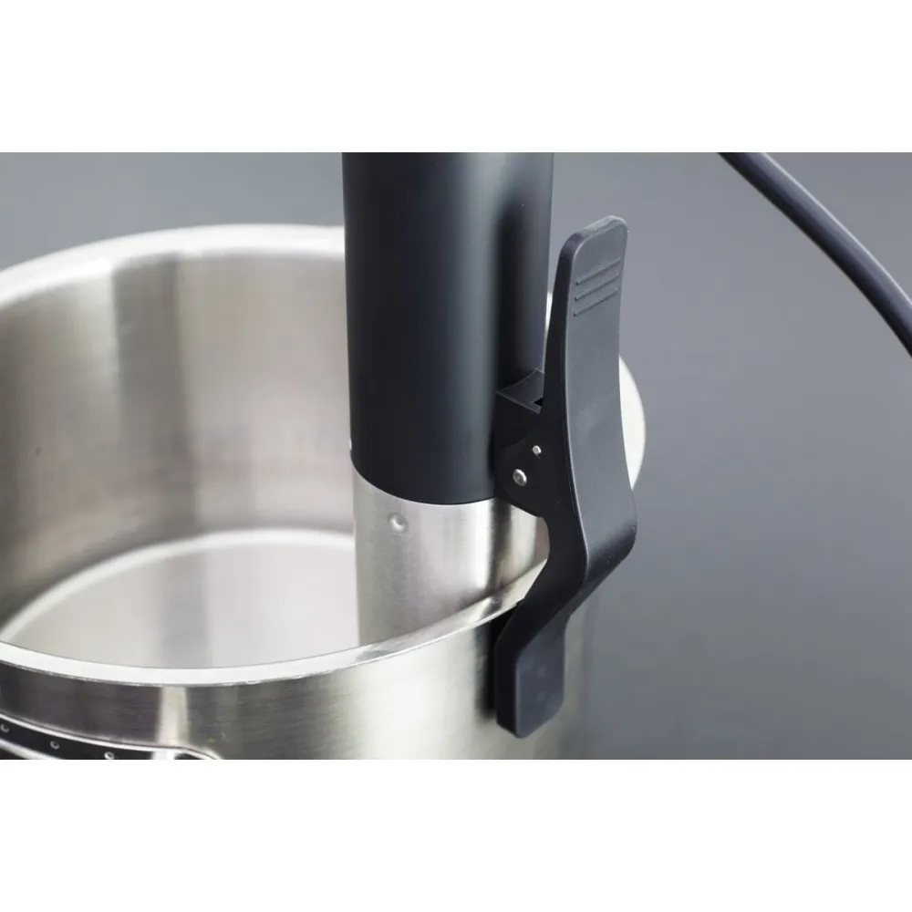 Когда все распределено по порциям и упаковано остаётся лишь приготовить вкусную еду, правильно и без потери всех её полезных свойств. Сделайте это с помощью Су-Вид CASO SV 1200 Smart. Выберите нужную температуру на цифровом дисплее. В процессе приготовления можно регулировать температуру в диапазоне от 0°C до 90°C, и установить таймер до 99 часов. Крепление в виде прищепки поможет закрепить термостат на любой емкости. Вода нагревается до заданной температуры быстро, после чего устройство переходит в режим ожидания для поддержания постоянной температуры в емкости.