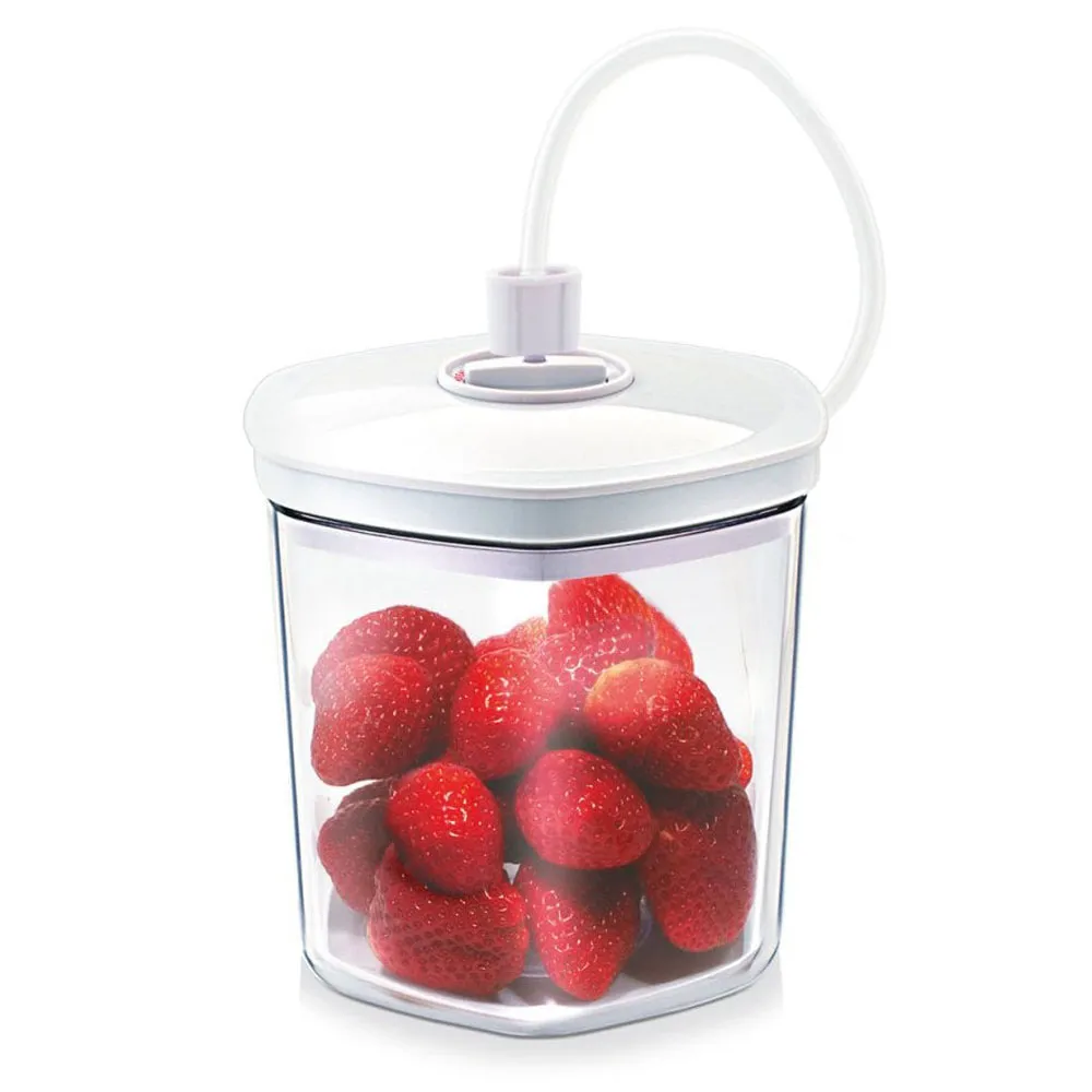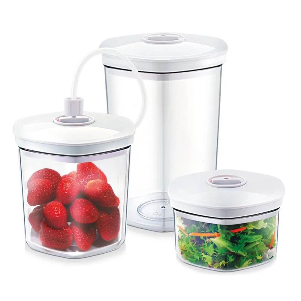 Чтобы продукты как можно дольше сохраняли свои питательные свойства, аромат, вкус и были пригодными для употребления в пищу, рекомендуется хранить их в специальных вакуумных контейнерах. В комплект контейнеров для вакуумной упаковки входит три вакуумных контейнера объемом 0.75, 1.4 и 2 литра, а также вакуумная трубка.