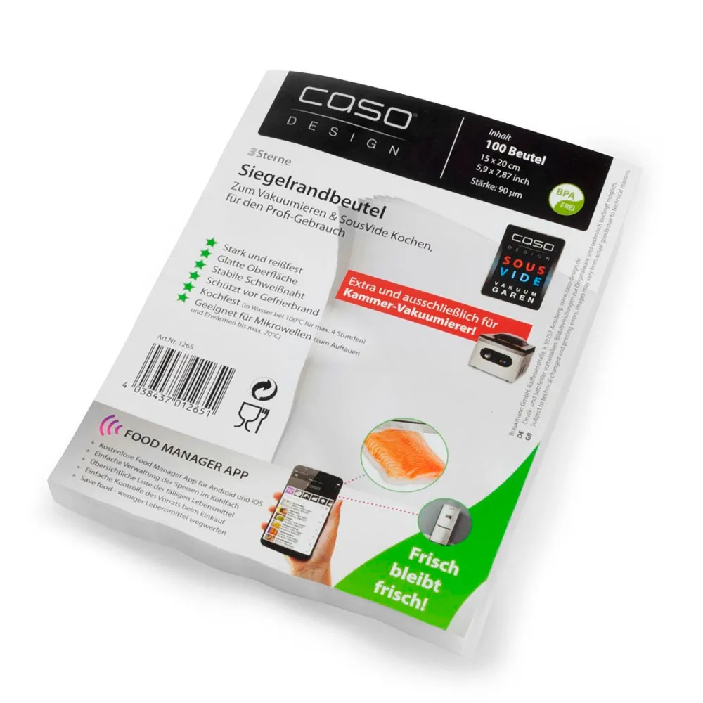 Вакуумные пакеты CASO подходят для упаковщиков работающих с гладкими пакетами, производятся из качественных пищевых полимеров, в составе которых не содержатся вредные элементы. Пленка отличается высокой прочностью и стойкостью к разрыву. Пленка является термостойкой, подходит для заморозки, СВЧ печей, а также приготовления продуктов в су виде. Совместимы с камерными вакуумными упаковщиками.