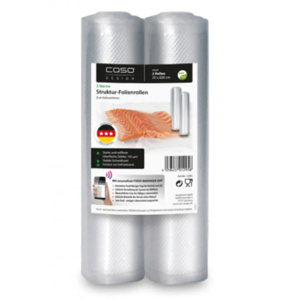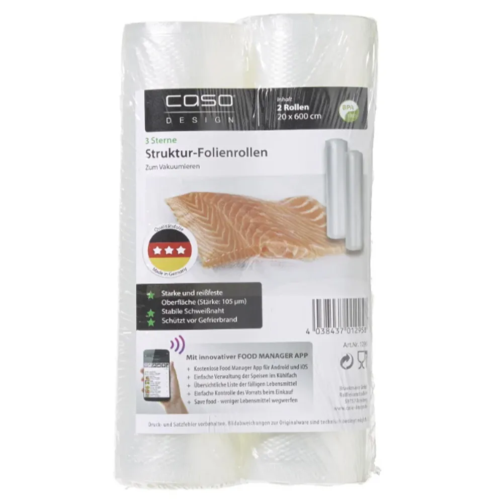С рулонами для вакуумирования обеспечивается удобное хранение свежих овощей и фруктов, неиспользованных продуктов, полуфабрикатов, маринование мяса и рыбы, создание заготовок. В комплекте 2 рулона размером 20х600 см, а также стикеры с QR-кодом. При помощи приложения «Caso Food Manager» Вы всегда сможете контролировать количество продуктов в холодильнике, а также сроки их хранения.