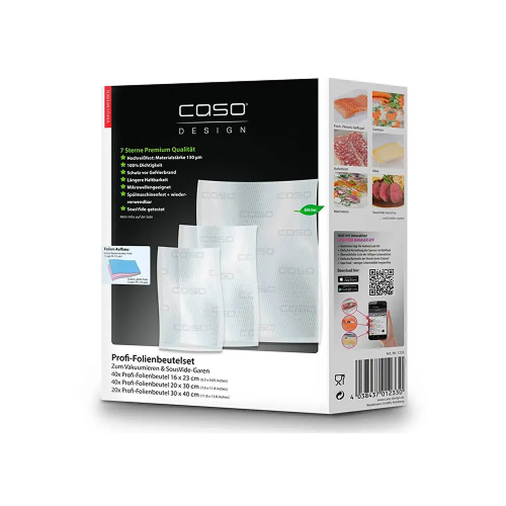 Набор вакуумных пакетов CASO 7 Sterne 16?23 см (40 шт), 20?30 см (40 шт) и 30?40 см (20 шт), толщиной 150 мкм, предназначен для использования с вакуумными упаковщиками, обеспечивая надежное и долговременное хранение продуктов.