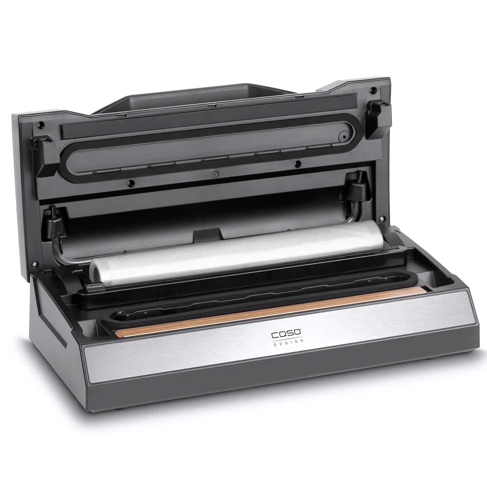 В комплект поставки входят: рулон плёнки 20 × 300 см, рулон плёнки 28 × 300 см, контейнер VacuBoxx Eco S, контейнер VacuBoxx Eco M, две пробки WineLock, шланг с адаптером, а также стикеры CASO Food Manager. Сварная планка рассчитана на пакеты и рулоны шириной до 30 см. Пакет запаивается двойным сварным швом. Есть встроенный резак для пленки.