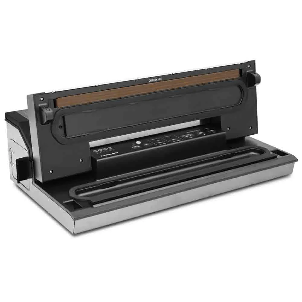 Данная модель вакуумного упаковщика для дома отличается компактным размером. Устройство выполнено в корпусе из нержавеющей стали. На верхней крышке расположена удобная ручка для закрывания. Вес – 6 кг. В конструкции есть съемная камера для жидкости.