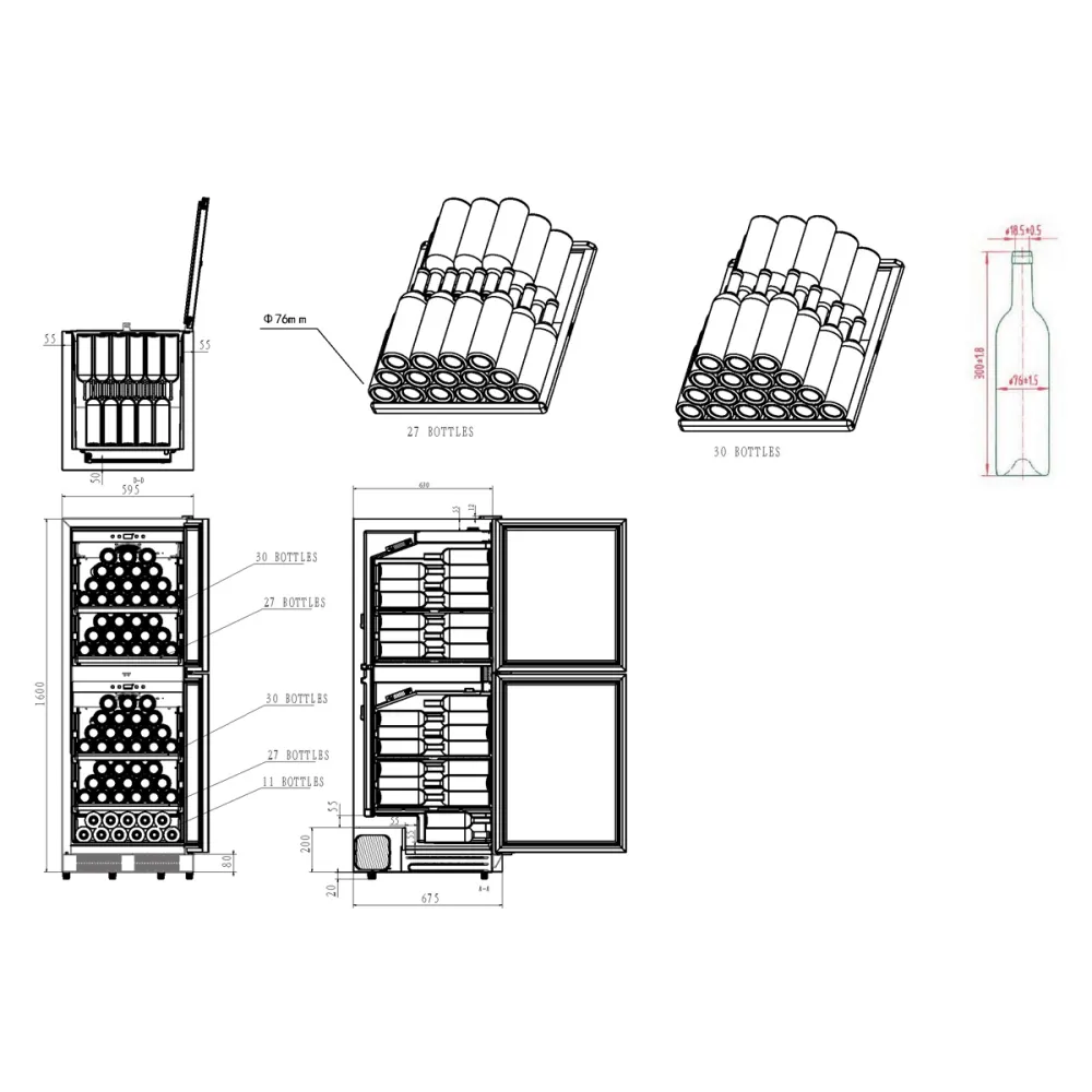 Винный шкаф оснащен двумя камерами, в каждой из которых есть вентилятор для распределения температуры. На стеклянной дверце устройства имеется специальный UV-фильтр, который защищает вино от прямого воздействия солнечных лучей и перепадов внешних температур. Дверь оборудована замком. Стальной корпус стойкий к царапинам. Уход за оборудованием осуществляется с помощью неагрессивных моющих средств.