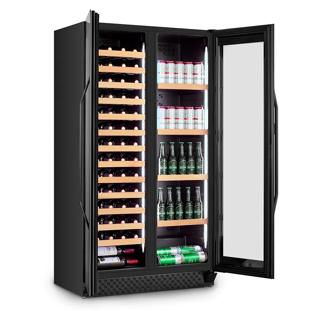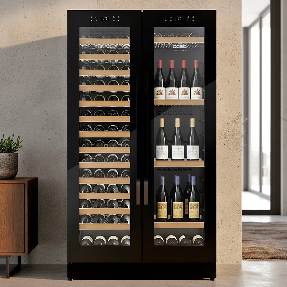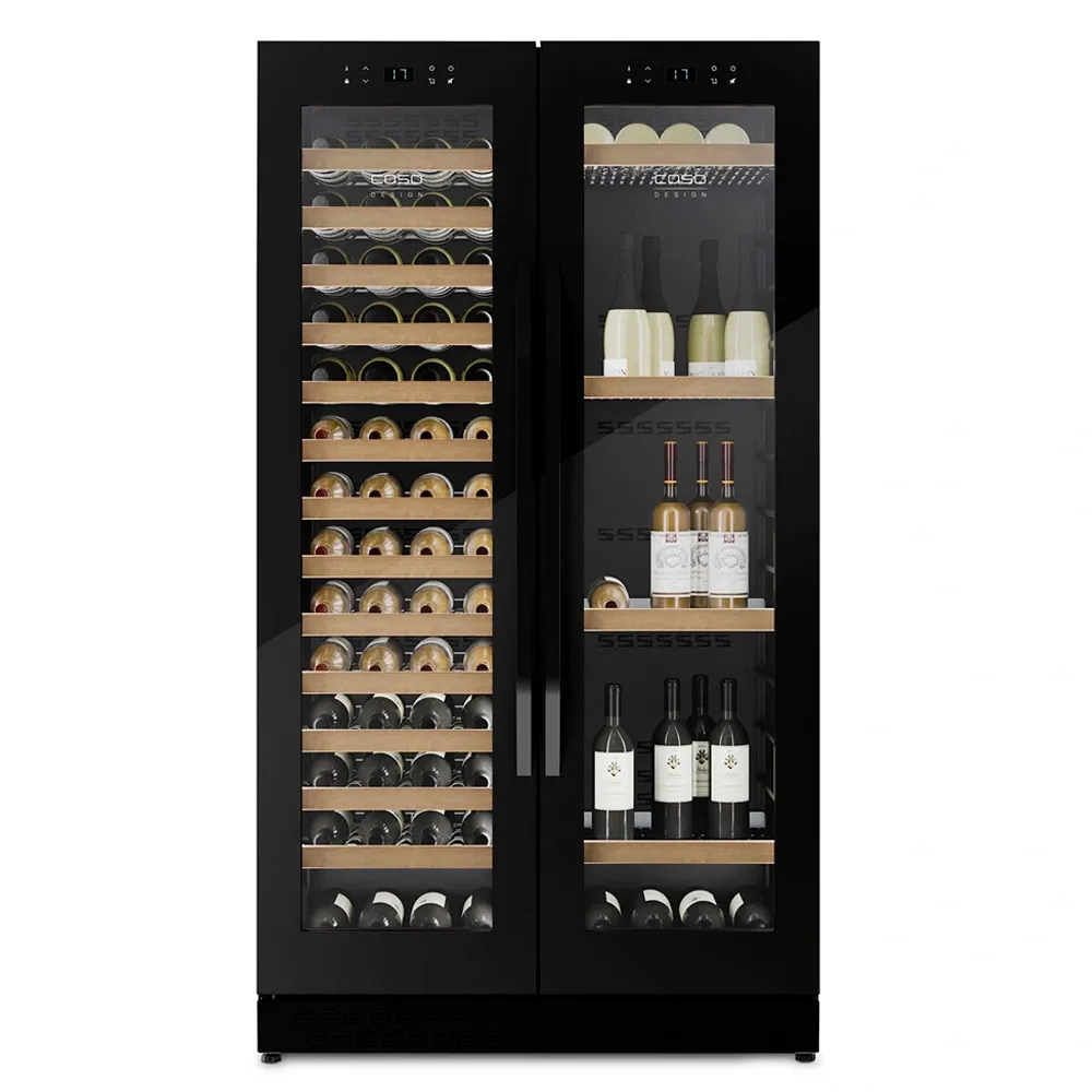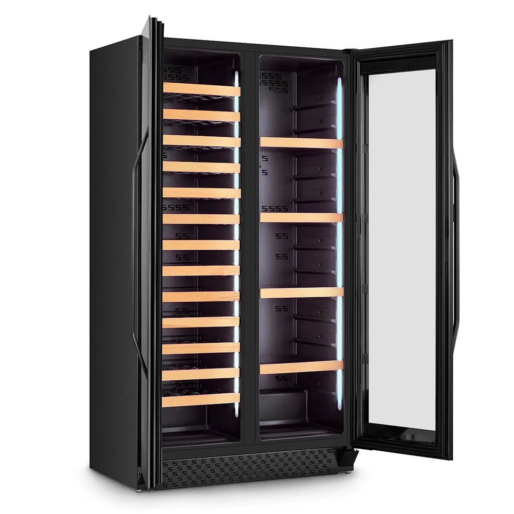 Компрессорный винный холодильник рассчитан на хранение до 122 бутылок вина. Устройство оснащено двумя отдельными температурными камерами с индивидуальной настройкой режима для каждой. Управление винным шкафом осуществляется через сенсорную панель, на которой размещены светодиодные индикаторы температуры для обеих камер. Рабочий диапазон температур составляет от 5 до 20 °C (41–68 °F). Равномерное распределение температуры внутри камер обеспечивает активный вентилятор. Холодильник оснащён тихим компрессором, что делает его эксплуатацию комфортной в жилых помещениях. Дверца оборудована 3‑слойным защитным стеклом с УФ‑фильтром и тонированным покрытием. Внутреннее пространство организовано следующим образом: слева расположены 13 полок, справа — 4 металлические полки. Для удобства доступа к содержимому предусмотрена боковая внутренняя подсветка.