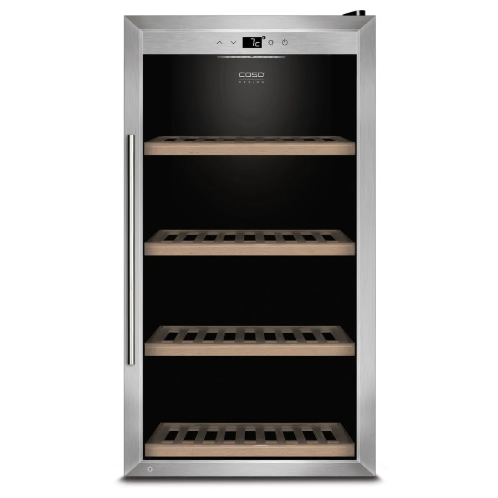 Однозонный компрессорный винный холодильник CASO WineSafe 75, предназначенный для хранения вина в температурном диапазоне от 5 до 20°C. Для игристых вин – 5-8°C, для белого - 8°C, для зрелого белого и розового - 8-11°C, для молодого красного - 14-15°C, для зрелого красного - 18°C.